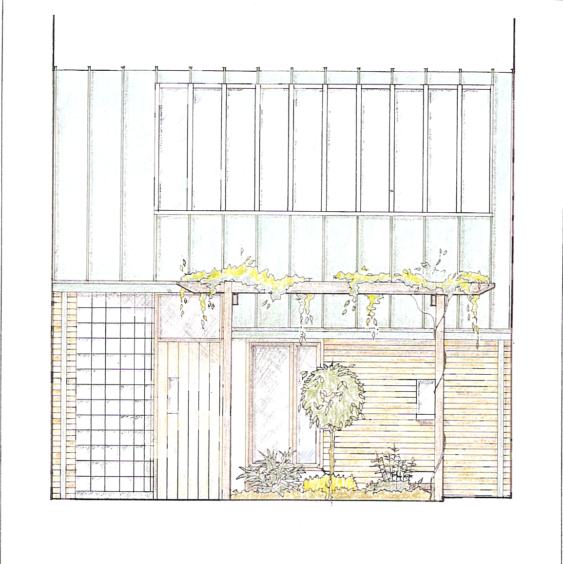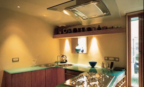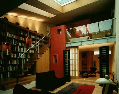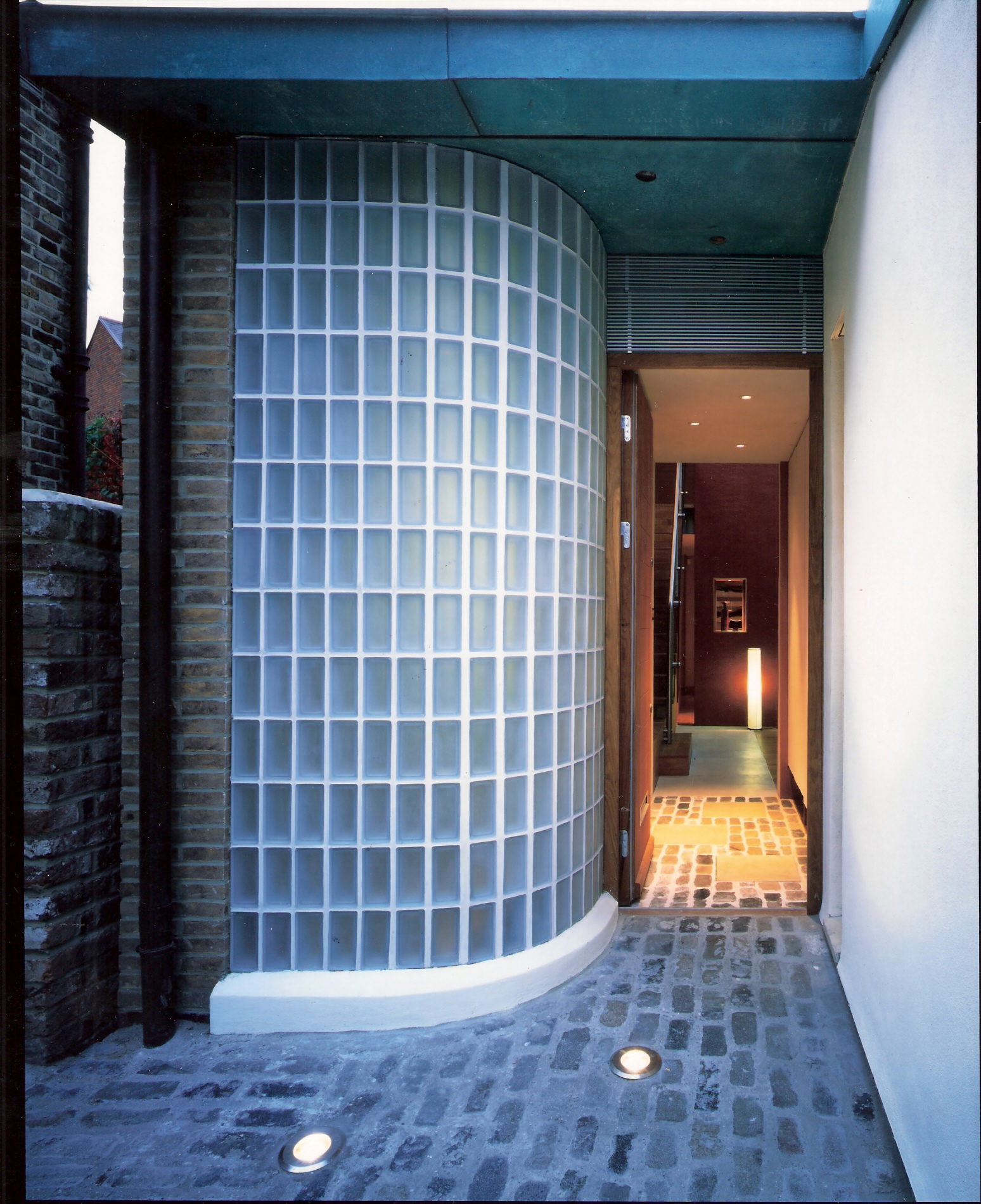Elsden Mews is a new build home in a conservation area in Bethnal Green, London. Sited in a former mews between two Victorian terraces, the new house is set at the back of the site, creating a south facing entrance courtyard. Externally, the house combines hand made bricks with a sleek curved wall of glass blocks which define the entrance. The roof, designed to minimise the over shadowing of neighbouring gardens, is of patinated copper. Internally, the dining area, study and bedroom open into the generous double height living room which, flooded with light from a glass roof, provides the focus of the design. The building is designed to be extremely energy efficient. Triple glazed windows are used. Rain water is collected for re-use and low temperature under floor heating ensure high levels of comfort and low fuel bills. The house was completed in September 2002.